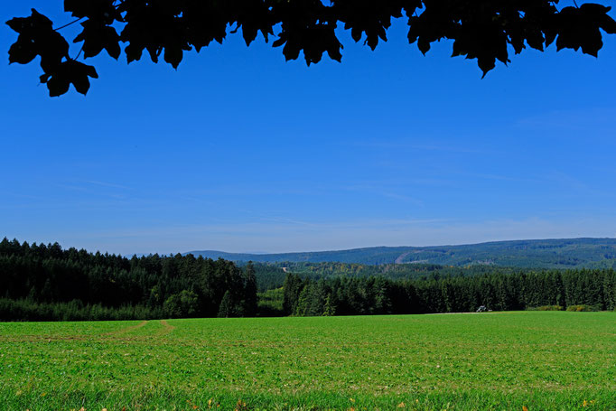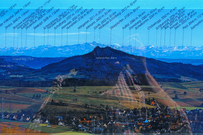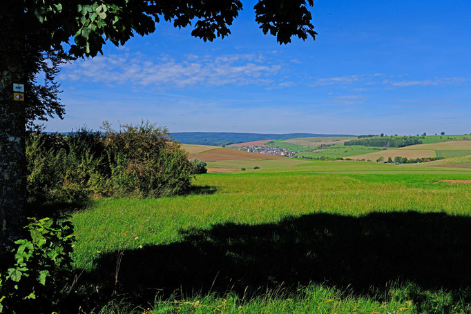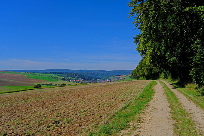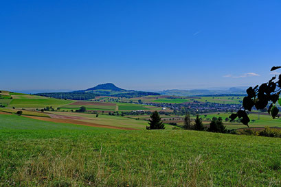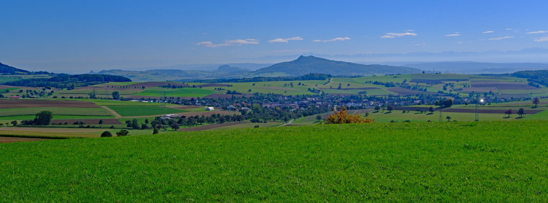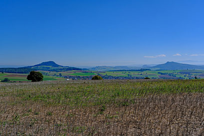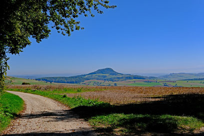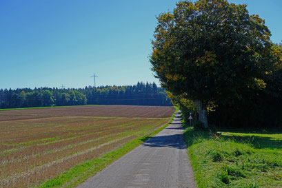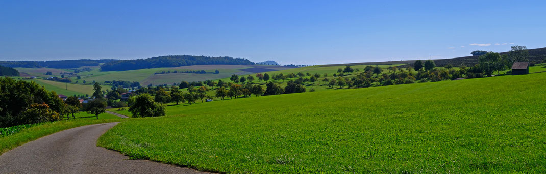 Von jetzt an begleitete uns der Blick auf die Vulkanberge für eine gute Stunde. Nach einiger Zeit erreichten wir den „Hegaublick“, einen Platz den wir schon bei unserer Anreise nach Sigmaringen kennengelernt hatten. Der Platz hat seinen Namen sicher nicht umsonst. Auf dem alten Postweg ging es weiter Richtung Nordost. Auf einmal wurde der Blick nach Norden frei und wir entdeckten in einiger Entfernung unser Ziel, Leipferdingen. Naja, dann müsste es wohl bald mal nach links gehen? Nach einer kleinen Weile kam dann auch der Abzweig. Das war total komisch. Gerade hattest du noch das Hegau mit seiner besonderen Landschaft vor Augen und jetzt eben die besondere Landschaft des Klettgaus, die wir ja schon am Morgen durchwandert hatten. Es ging moderat bergab, immer unser Ziel vor Augen. Einmal sollte es noch nach rechts gehen und in Serpentinen den Berg hinauf.