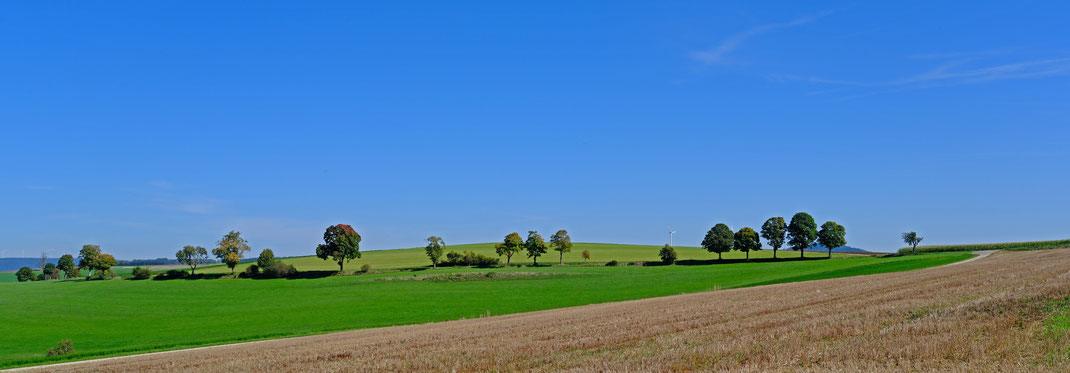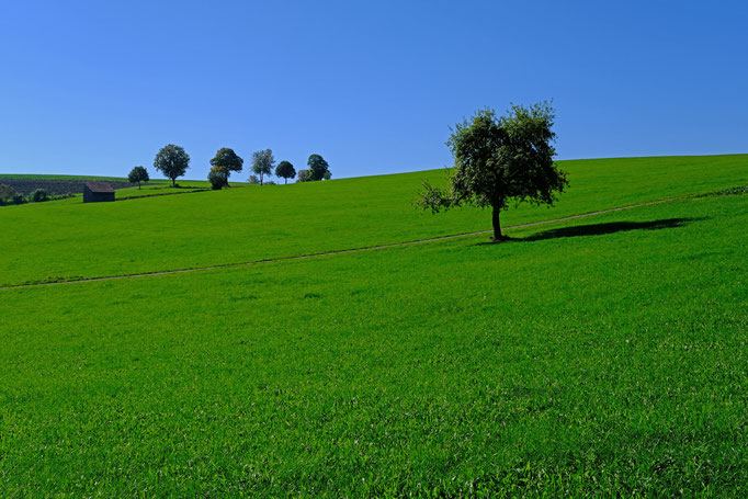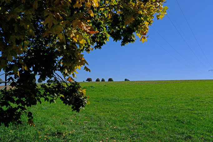Eigentlich heißt der Weg „Rund um Leipferdingen“ und ist auch als solcher hervorragend ausgeschildert. Aber landschaftlich gesehen startest du die Wanderung in dem stark durch die Landwirtschaft genutzten Teil der Wanderung im Klettgau mit den großen Ackerflächen, die jetzt im Herbst unterschiedlichst bewirtschaftet werden. Zum einen wurde die vielleicht letzte Mahd auf den Wiesenflächen durchgeführt und die Bauern hatten offensichtlich große Mühe alles noch vor den angekündigten Regen einzufahren. Zum anderen wurde gepflügt, geeggt und gesät, was das Zeug hielt. Überall waren Traktoren und sogar ein Mähdrescher unterwegs.