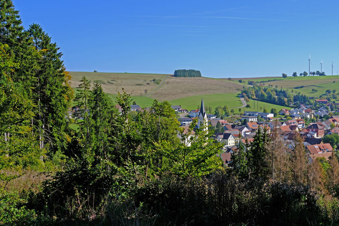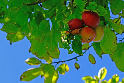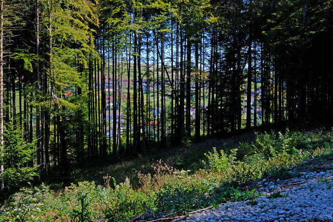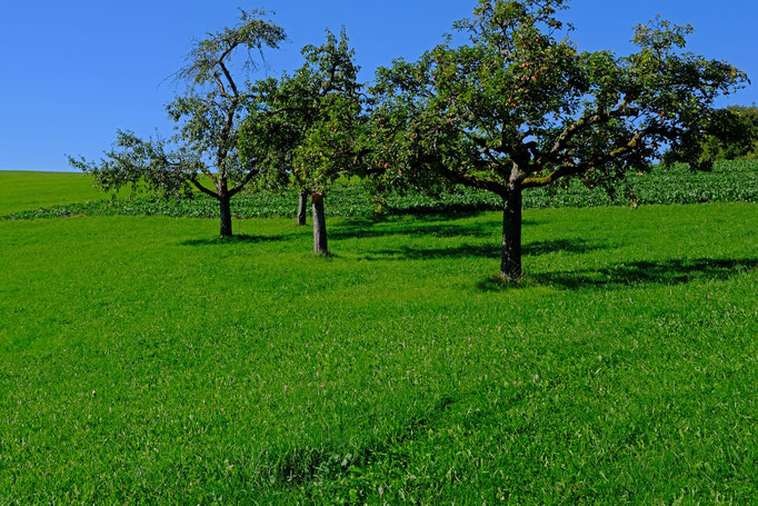 Als wir oben aus dem Wald hervor traten, offenbarte sich uns der Blick auf Leipferdingen, schön eingebettet zwischen 2 Bergen. Verschiedene Bäume zeigten durch ihre Verfärbung an, dass der Herbst vor der Türe steht. Herbstzeit ist Erntezeit. Die Obstbäume die jetzt vor uns auftauchten waren gut behangen mit lecker aussehenden roten Äpfeln. Jetzt ging es durch Wiesen und Felder immer moderat bergan. Ue, wie der Alemanne sagt. Wir gingen bis zu einer Schutzhütte am Wegesrand und machten eine kleine Trinkpause. Natürlich mit „Hinsetzen“, „Füße hochlegen“ und „Tag genießen“. Es war ein richtiger Sommertag heute. Es sollten am Ende bis zu 28°C werden. Jetzt waren es noch angenehme Wandertemperaturen.