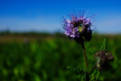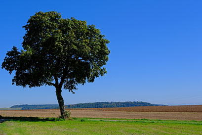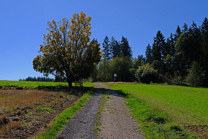 Die Landschaft wechselte von Wiesen, auf denen gerade das Heu eingefahren wurde zu erdigen Flächen, die gerade gepflügt oder geeggt wurden. Überall gab es einzeln stehende Bäume, die das ganze optisch auflockerten. Wirklich eine schöne Landschaft. Es war 12 Uhr. Unter einem Ahorn stand eine Bank, über und über mit Flechten überzogen. Die steht hier schon länger. Mit unseren Sitzkissen aus dem Rucksack setzten wir uns und aßen unser Mittagessen aus dem Rucksack. Nein, leider gab es heute kein Bratwurstbrot. Aber Salamibrot mit Remoulade und Käsebrote sind auch nicht zu verachten. Und hinterher gabs noch ein Knoppers. Das alles bei blauem Himmel an frischer Luft inmitten der Natur ist fast nicht mehr zu toppen. Außer natürlich mit Bratwurstbrot.