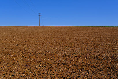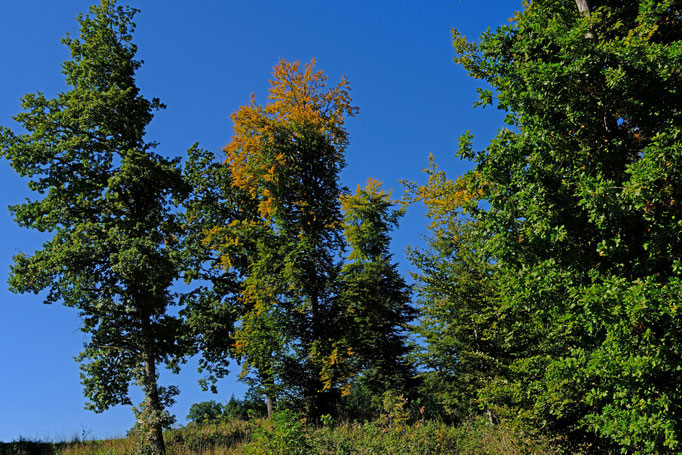 Bestimmt 7 oder 8 Bussarde und Rotmilane suchten den Himmel nach der besten Thermik für ihren Aufstieg ab. Auch über dem Land wehte ein kleiner Wind, der die langsam ansteigenden Temperaturen erträglicher machte. Unser Weg machte jetzt einen scharfen Knick nach rechts und wir gingen über eine fast unbefahrene Straße durch einen lichten Wald, leicht bergab um unseren südlichsten Punkt der Wanderung zu erreichen.