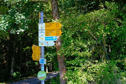 Wahrscheinlich haben wir der Abzweigung so entgegen gefiebert, dass wir ein Schild falsch gedeutet und eine Abzweigung zu früh genommen haben, wie sich einen Kilometer später herausstellte. Einen Kilometer hin und einen zurück macht 2 Km Umweg. Hier greift wieder das alter Wanderer-Sprichwort: „Je falscher die Richtung, desto länger der Weg.“ Am Ausgangspunkt unseres Umweges haben wir dann entschieden, das wir uns den letzten Berg unserer Route dann doch sparen und direkt wieder zum Auto zurück gehen. Immerhin waren mittlerweile die 28°C erreicht und die Sonne knallte vom Himmel. Und mit unserem Umweg haben wir auch die 15 Km-Marke erreicht.