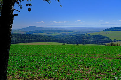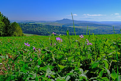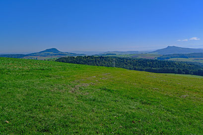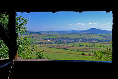 Du trittst aus dem dunklen Wald heraus ins Helle und es liegt dir zu Füßen. Das Hegau. Nach vorne hin fällt das Gelände stark ab und macht Platz, damit der Blick über kleine Ortschaften, Wiesenflächen und natürlich die Vulkanberge schweifen kann. Und dahinter die Alpenkette (da es so dunstig war, kann man das auf den Fotos nur schwer erkennen). Genauso hatte ich mir das vorgestellt, als ich eine Hegau-Wanderung geplant hatte. In einer kleinen Hütte im Schatten nahmen wir Platz und betrachteten alles in aller Ruhe. So etwas Schönen sieht man nicht jeden Tag.