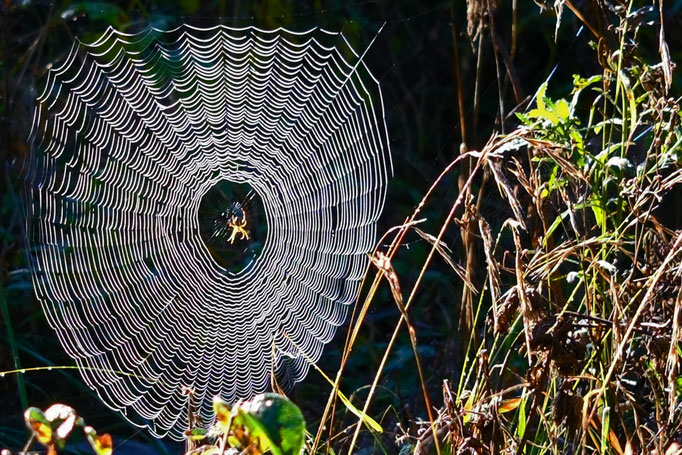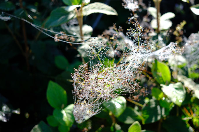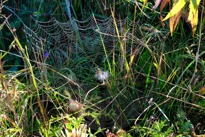 So um halb Elf waren wir da und parkten an der Festhalle. Wanderschuhe anziehen und los. Erst mal Richtung Bahnhof, das war ja leicht. Du weißt ja nicht, was auf dich zu kommt, also macht es Sinn sich vorher auf eine neue Wanderung vorzubereiten. Auf der Karte des SWV sah es so aus, als würde unser Weg die Markierung des SWV verlassen, vor Ort war das nicht so. Scheinbar hatte irgend jemand nach Herstellung der Karte die Wegführung angepasst. Umso besser. Es war noch relativ schattig, an diesem Septembermorgen. Wir gingen hinter dem Bahnhof eine Steigung hoch und sahen links am Hang jede Menge Spinnenweben, in denen der Morgentau schimmerte. Sind eigentlich im Herbst mehr Spinnen unterwegs als sonst?